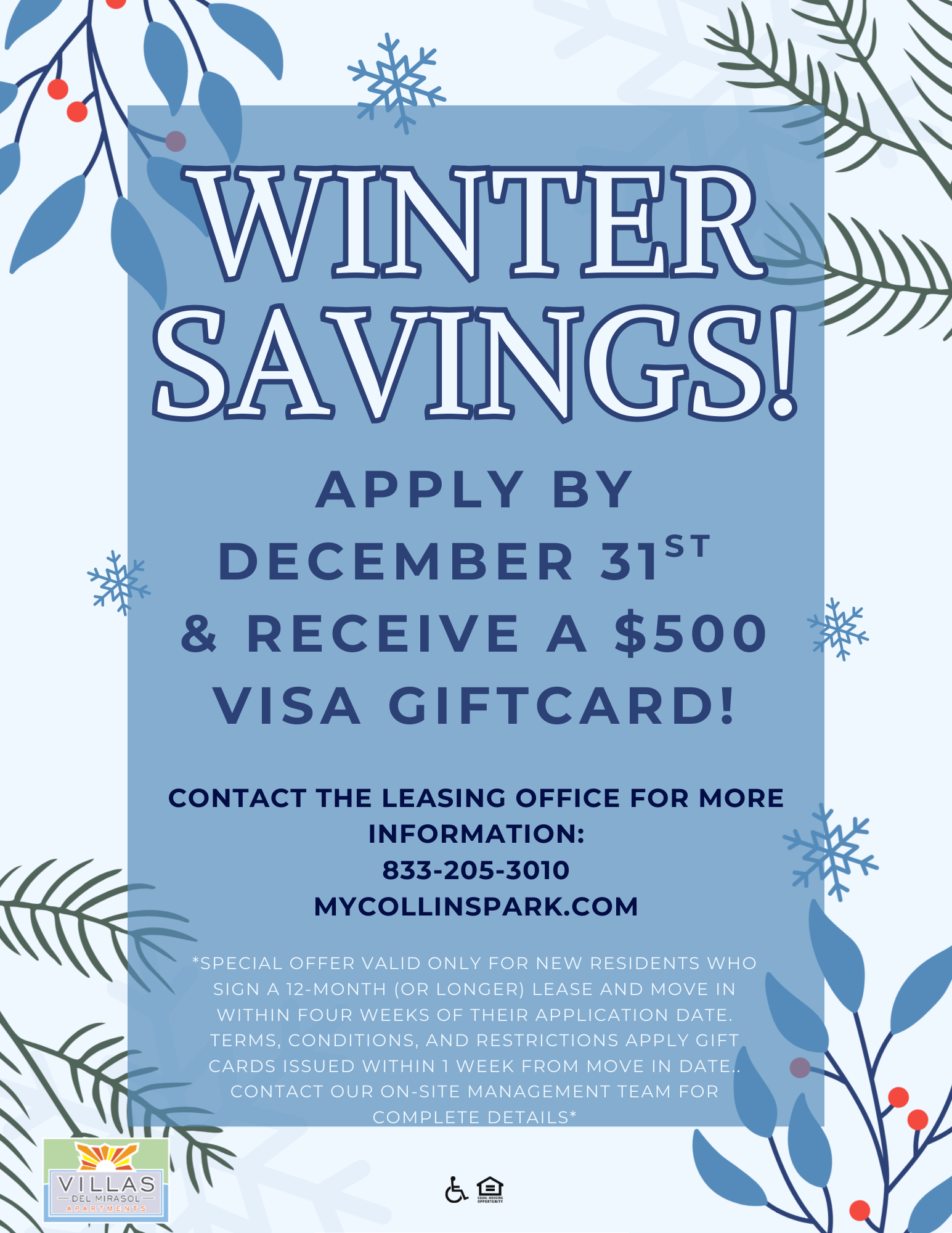 Apply by December 31st & receive a $500 Visa gift card on 12+ month leases! Contact the Leasing Office for more information!⤵️ ¡Solicita antes del 31 de diciembre y recibe una tarjeta de regalo Visa de $500 en contratos de arrendamiento de más de 12 meses! ¡Contacta con la oficina de arrendamiento para más información!⤵️